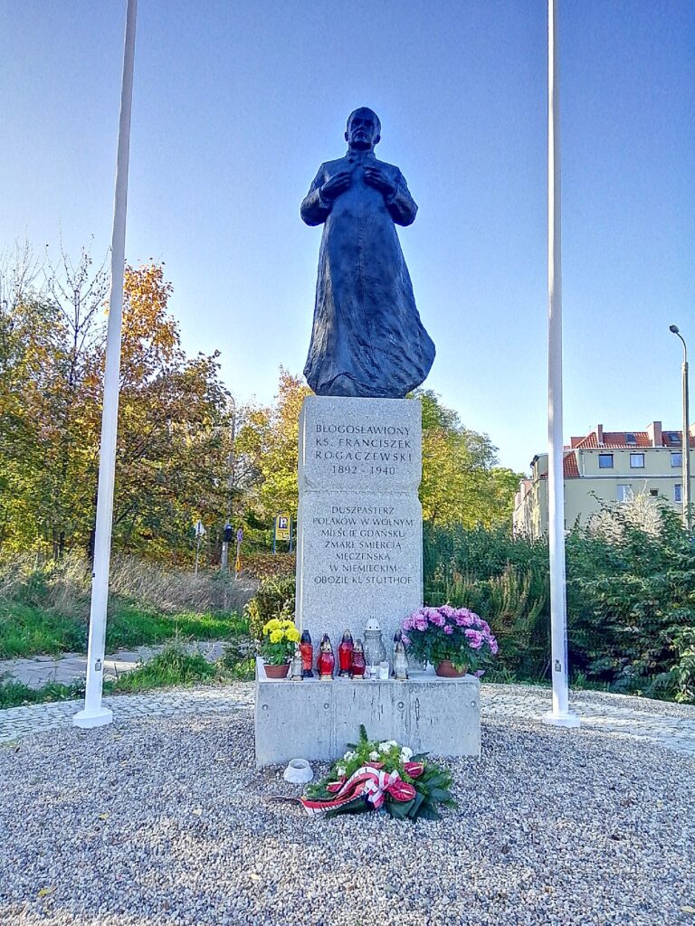 Pomnik błogosławionego ks. Franciszka Rogaczewskiego na skwerze nieopodal kościoła pw. Chrystusa Króla w Śródmieściu przy ul. Księdza Franciszka Rogaczewskiego 55.