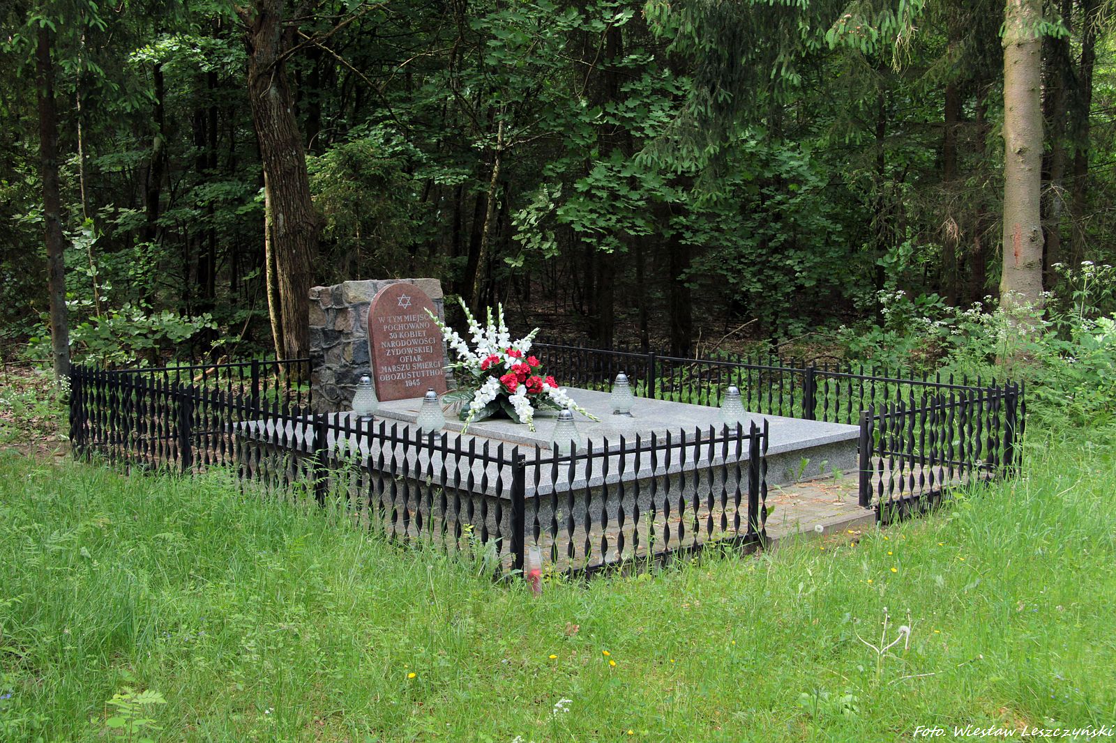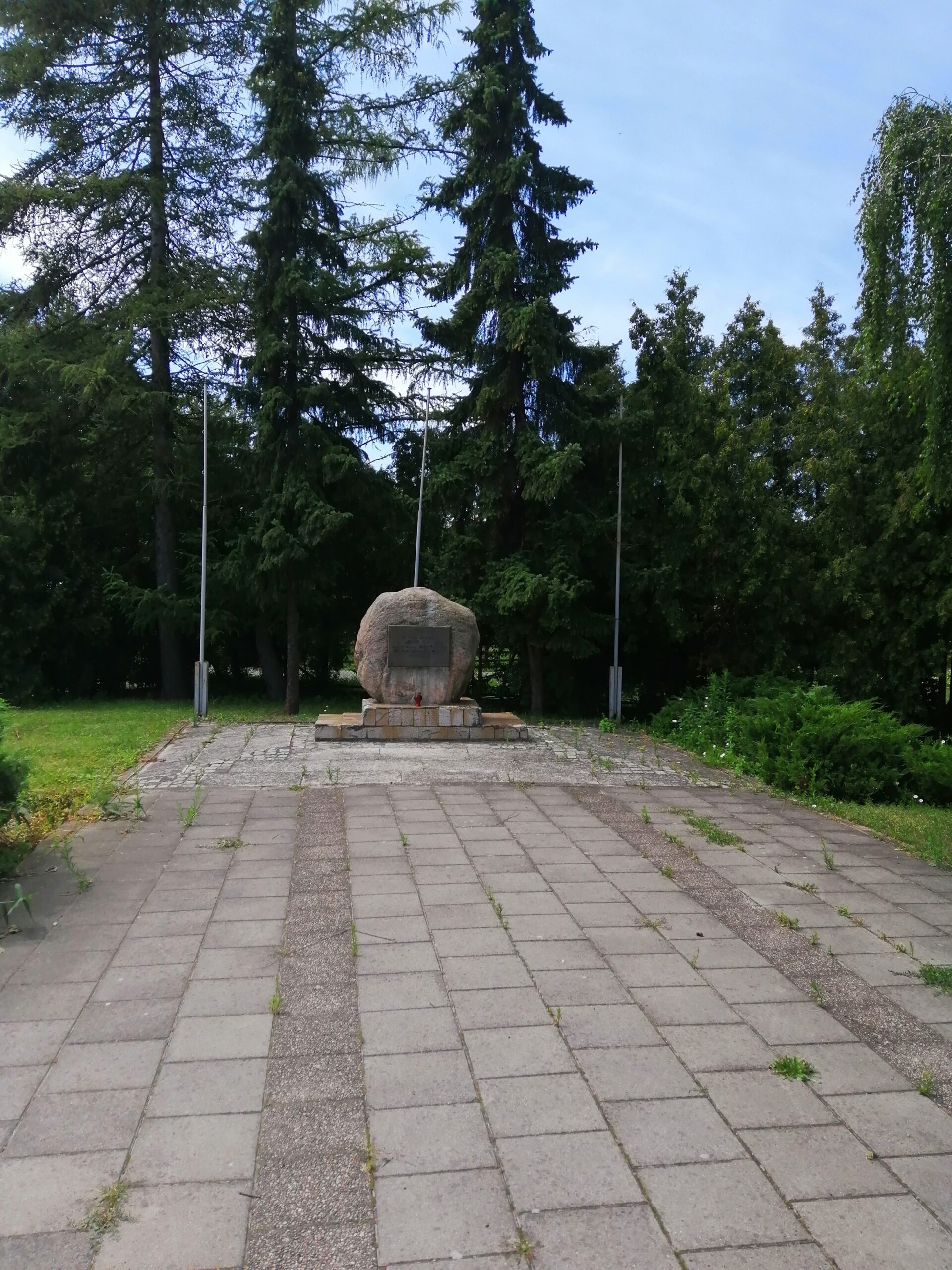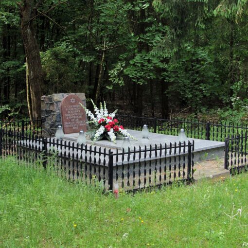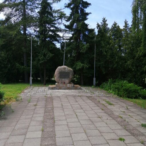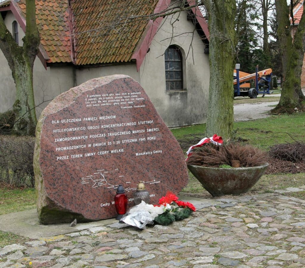 Kamienny obelisk przy kościele pw. Św. Aniołów Stróżów z inskrypcją upamiętniającą więźniów obozu Stutthof zmarłych w dn. 25 i 26 stycznia 1945 r. podczas ewakuacji lądowej na terenie Gminy Cedry Wielkie.