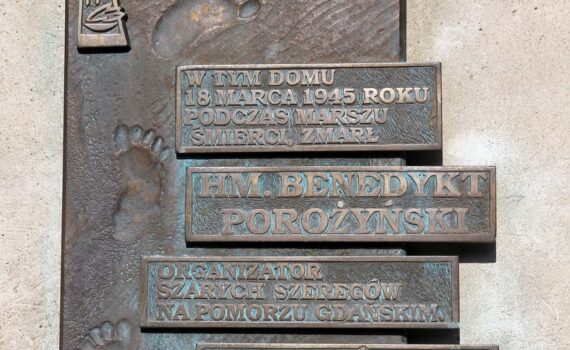 Tablica pamiątkowa na budynku mieszkalnym przy ul. Wejherowskiej upamiętniająca miejsce śmierci hm. Benedykta Porożyńskiego, więźnia obozu koncentracyjnego Stutthof, który zmarł w tym budynku, po wyzwoleniu 18 marca 1945 r.