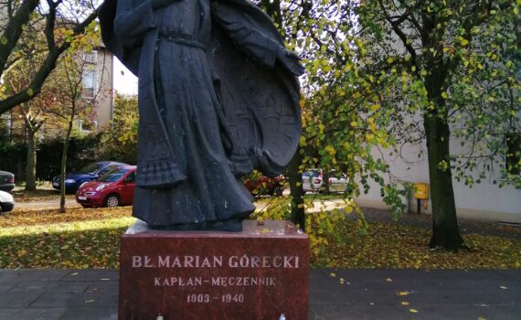 Nowy Port, na pomnik błogosławionego ks. Mariana Góreckiego, rektora kaplicy M.B. Częstochowskiej w Nowym Porcie i prefekta Gimnazjum Polskiego Macierzy Szkolnej w Gdańsku przy ul. Marynarki Polskiej.