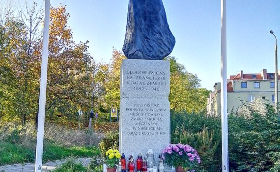 Pomnik błogosławionego ks. Franciszka Rogaczewskiego na skwerze nieopodal kościoła pw. Chrystusa Króla w Śródmieściu przy ul. Księdza Franciszka Rogaczewskiego 55.